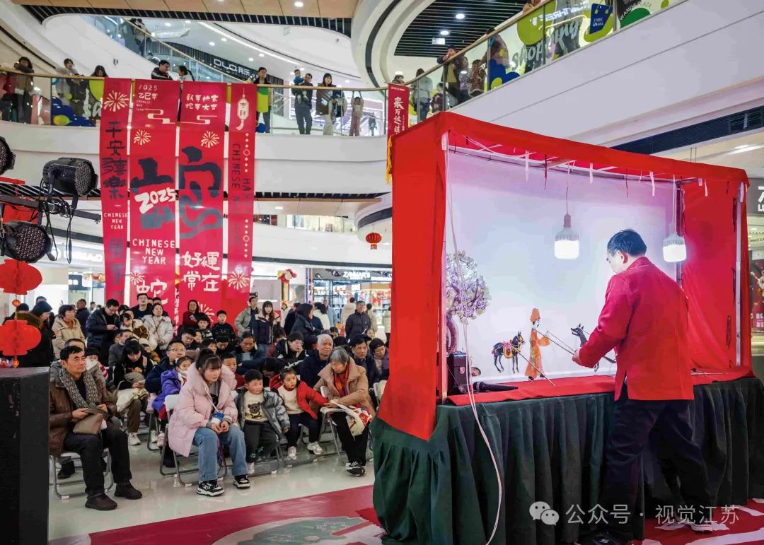 1月31日,扬州邗江万达商场内,顾客观看非遗皮影戏表演。高翔摄