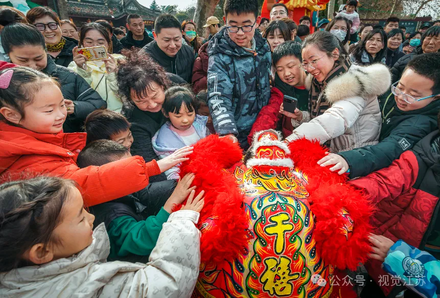 2月2日大年初五,镇江西津渡舞狮人与游人互动,大人小孩围着狮子,用手摸摸狮子头,新年讨个好彩头。董巍威摄