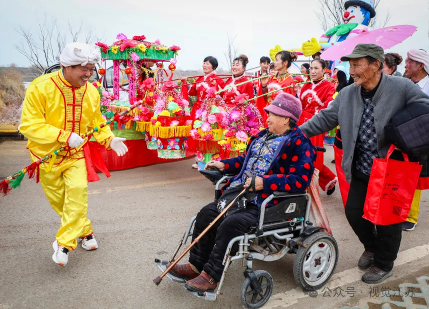 2月15日,宿迁市泗洪县临淮镇民俗表演队伍参加巡游活动,演员和观众欢乐互动。刘烨摄