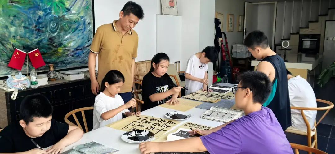▲近日,由徐州市文联书画研究院精心打造的首期“彭城书画大课堂”书法公益培训,在淮海城市美术馆正式开课。近十名热爱书法的少年儿童齐聚一堂,执笔蘸墨,开启了一场浸润传统文化的暑期艺术之旅。