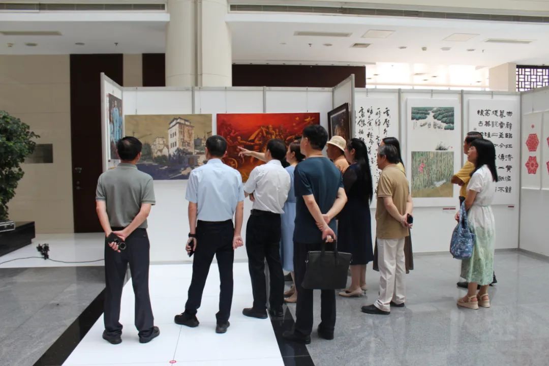 ▲8月25日,“红色记忆 江洲烽火”美术书法作品展于扬中市行政中心一楼大厅开幕。本次展览共展出扬中书画家与书画爱好者创作的优秀作品90余幅,涵盖书法、绘画、篆刻及剪纸等多种艺术形式。展览作品紧紧围绕抗战主题,多角度展现红色历史与时代精神。入展作品兼具浓郁的时代气息与较高的艺术水准,集中展现了扬中书画艺术创作的丰硕成果和艺术工作者的深厚情怀。