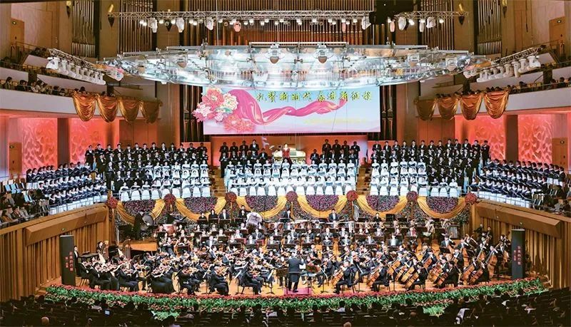 2023年10月9日,由中国文学艺术界联合会、中国音乐家协会共同主办的“礼赞新时代 奋进新征程”大型原创交响作品音乐会在国家大剧院音乐厅上演。图为音乐会现场。