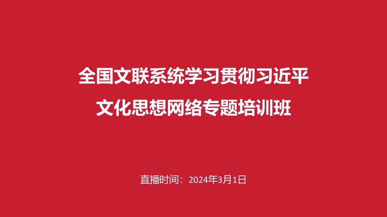 为深入学习贯彻习近平文化思想,按照全国宣传思想文化工作会议精神,由中国文联主办,中国文联人事部、理论研究室、文艺研修院、网络文艺传播中心承办的“全国文联系统学习贯彻习近平文化思想网络专题培训班”将于2024年3月1日举办。
