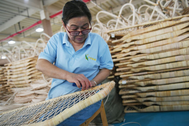 2023年9月7日,在位于汉中市的陕西良顺匠心实业有限公司,工作人员在编织藤制品。新华社记者张曼怡摄