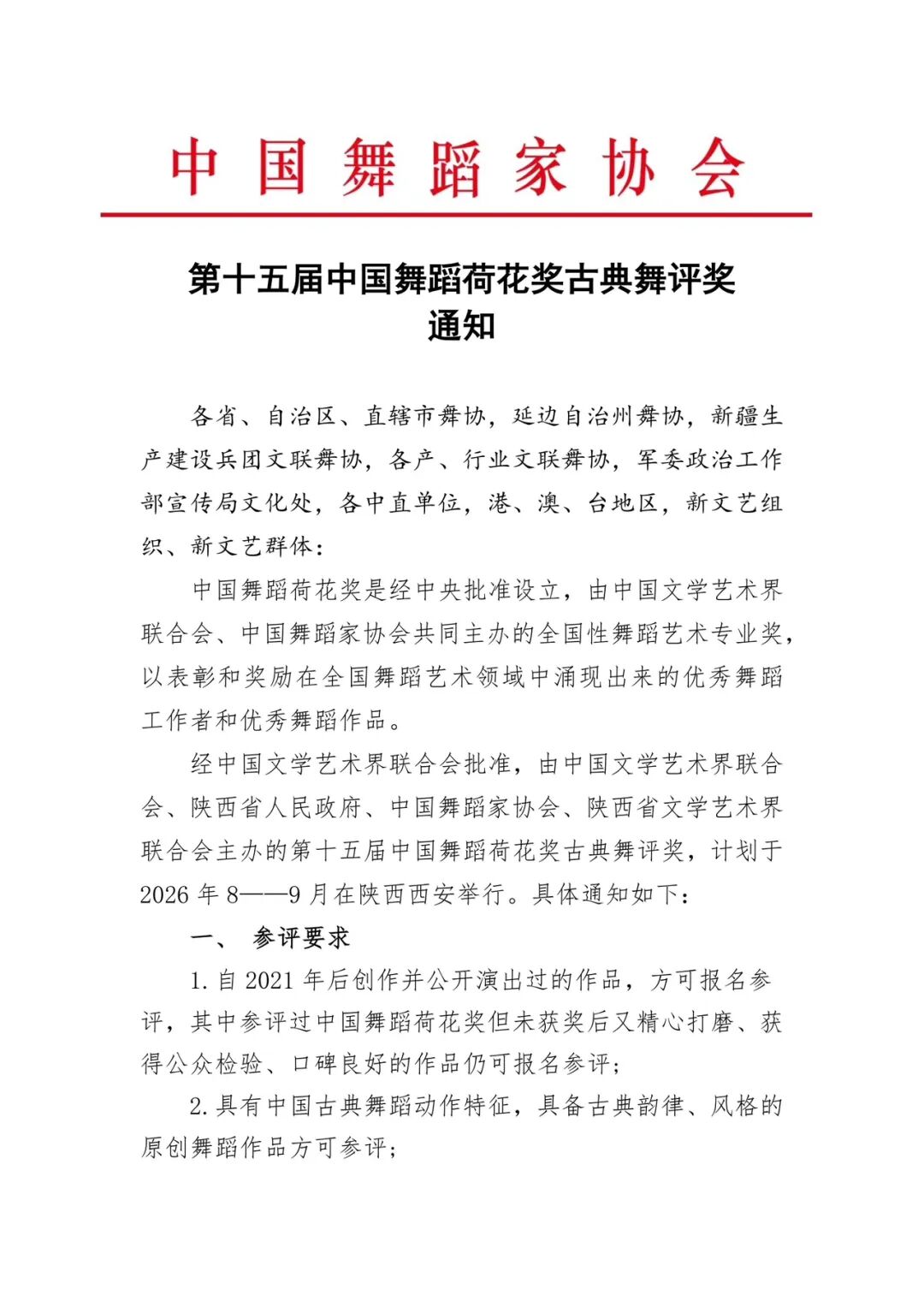 经中国文学艺术界联合会批准,由中国文学艺术界联合会、陕西省人民政府、中国舞蹈家协会、陕西省文学艺术界联合会主办的第十五届中国舞蹈“荷花奖”古典舞评奖,计划于2026年8-9月在陕西西安举行。