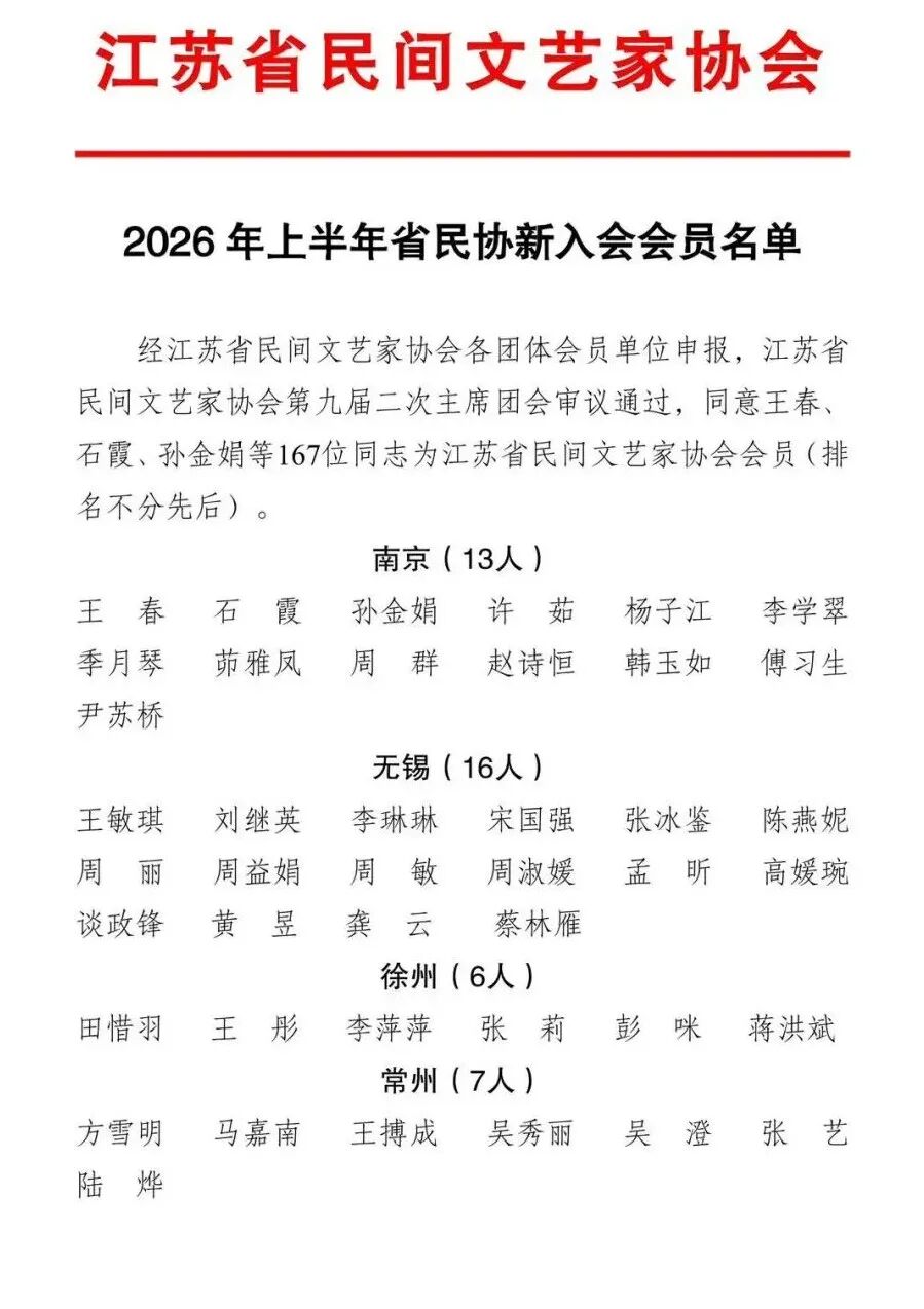 江苏省民协2026年上半年新入会会员名单