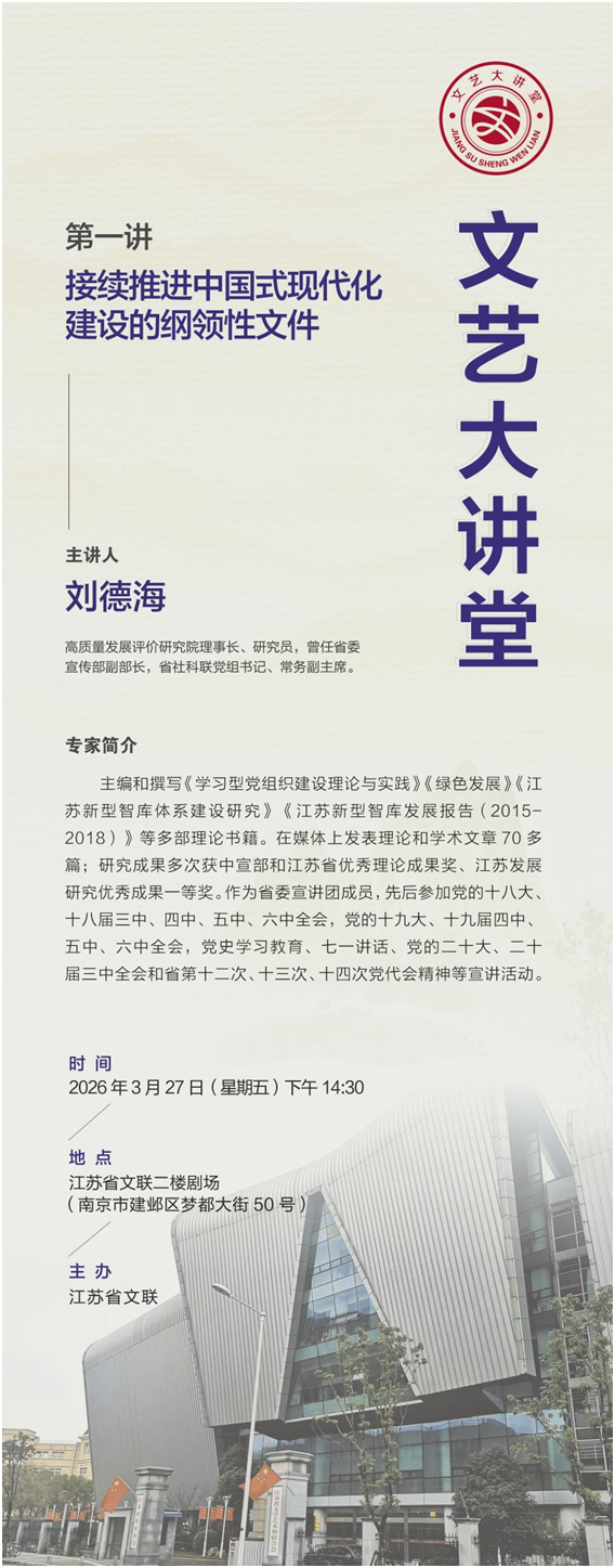 根据省文联“文艺大讲堂”活动安排,定于3月27日(周五)下午14:30在省文联二楼剧场举办“文艺大讲堂”。此次讲座将邀请高质量发展评价研究院理事长、研究员,省委宣传部原副部长,省社科联原党组书记、常务副主席刘德海,以《接续推进中国式现代化建设的纲领性文件》为题作专题讲座。敬请关注,欢迎参加!