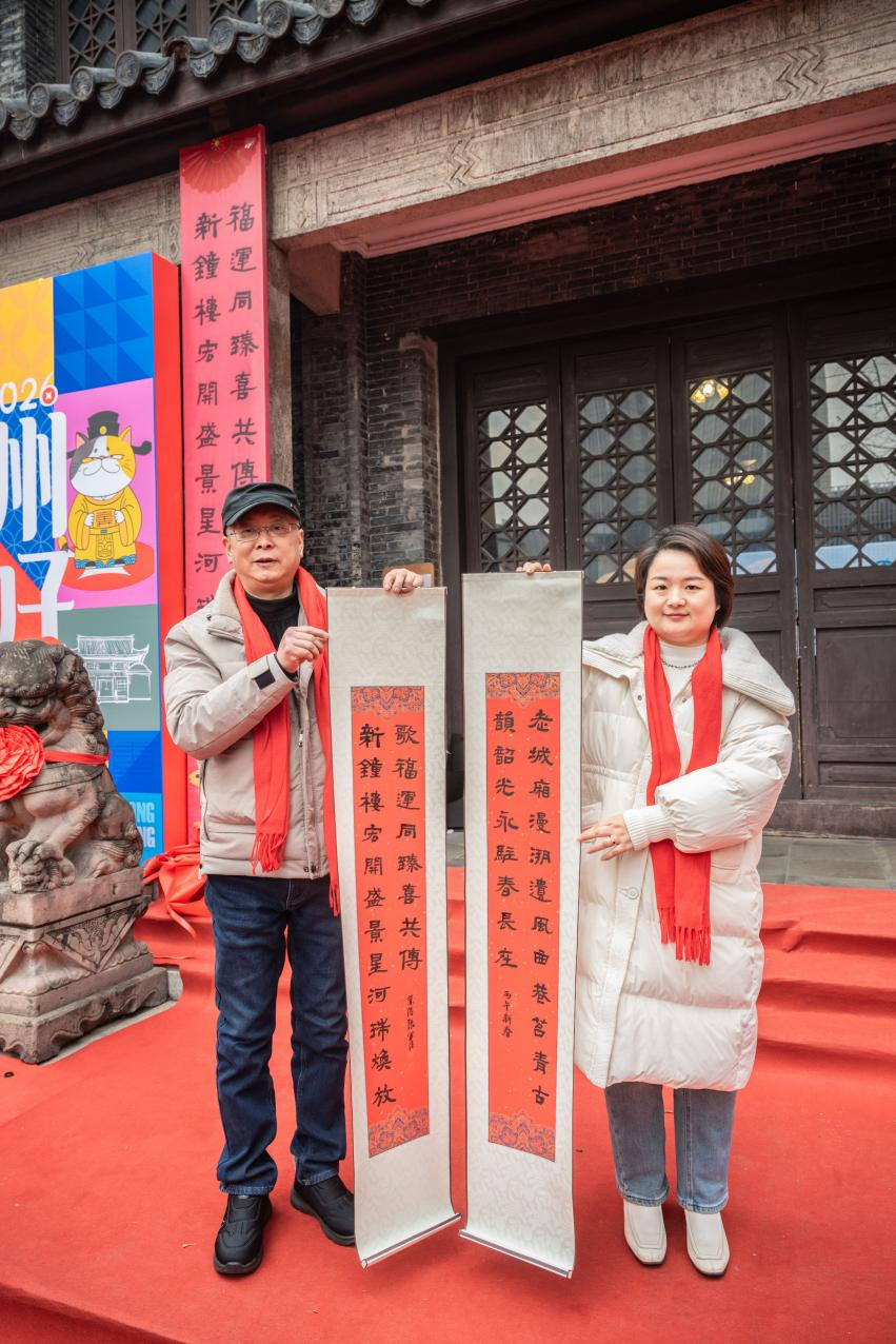 此次揭开的春联由常州市书协副主席、钟楼区书协主席张军佳创作完成,上联“老城厢漫溯遗风曲巷苔青古韵韶光永驻春长在”描绘了钟楼区作为常州古城核心,大庙弄、南市河等历史街巷在保护中焕发的蓬勃生机,下联“新钟楼宏开盛景星河瑞焕放歌福运同臻喜共传”则展现了钟楼区在发展中融合运河文化、数字经济与民生福祉的繁荣新景。整幅春联以时空对话的形式,既彰显老城厢文脉传承的深厚底蕴,又昭示新时代钟楼开拓进取的精神气象,悬挂于中山纪念堂,为春节增添雅意,更成为向市民讲述“钟楼故事”的文化窗口。