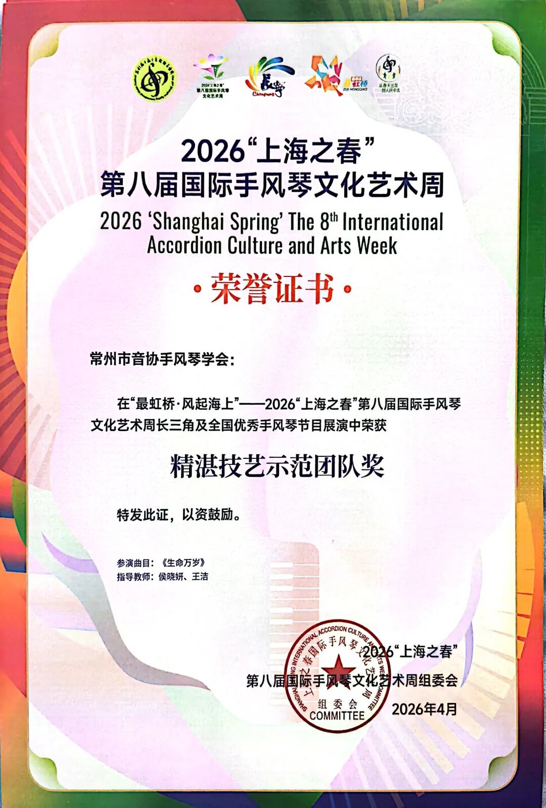 常州市音协手风琴乐团在2026“上海之春”第八届国际手风琴文化艺术周展演中荣获“精湛技艺示范团队奖”