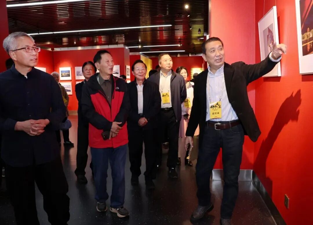 安徽省黄山市摄影家协会主席潘成(前排左二)在展厅向嘉宾介绍黄山市摄影家的作品