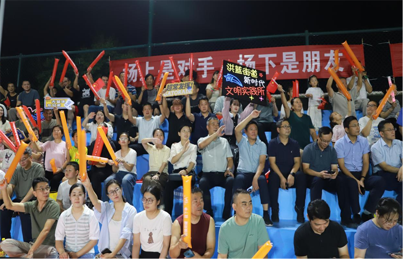 赛场外围,“文化服务驿站”的设置进一步延伸了“赛事+文化”的创新形态,志愿者们忙碌的身影成为另一道亮眼风景线。他们不仅向观众发放全民健身知识手册、文明社区建设宣传单,还精心组织趣味问答互动,将健康理念、文明新风通过轻松有趣的方式传递给每一位居民,实现了文化宣传与赛事服务的深度结合。“以前觉得篮球赛离我们很远,现在在家门口既能看激烈比赛,又能赏精彩演出、学实用知识,还能和邻居一起为球员加油,感觉整个社区都充满了活力!”洪蓝街道居民陈巧伢的真切感慨,道出了这场“篮球文化活动”的惠民初心,也印证了文体融合模式的可行路径。