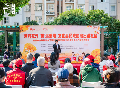 重阳佳节至,菊香戏韵浓。为弘扬尊老敬老传统美德,丰富社区老年人的精神文化生活,10月29日,由南京市文联主办,南京市戏剧家协会、秦淮区文联、光华路街道新时代文明实践所承办的“茉莉花开 ‘鑫’满重阳”文化惠民戏曲演出进社区活动在秦淮区银龙鑫苑社区文化广场举办。