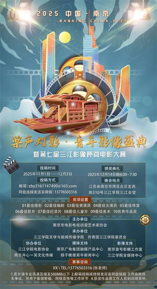 “三江影像杯”自2019年创办以来,已举办六届,成为校内最具影响力的影像赛事之一。 今年,在南京市电影电视动漫艺术家协会的指导与帮助下,“桨声灯影·青年影像盛典暨第七届三江影像杯微电影大赛”正式走出校园,让更多热爱影像的年轻人参与其中。