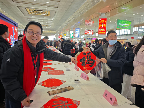 此次活动在南京站、溧水站同步开展。据不完全统计,共送出春联1500余副、“福”字2800多个。愿这一幅幅火红的春联,陪伴旅客温暖归途;愿这一缕缕清雅的墨香,浸润金陵新春佳节。