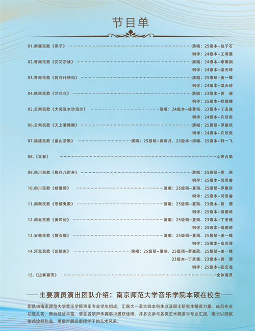 本场音乐会由南京师范大学音乐学院声乐专业学生参演,汇集大一至大四本科生以及硕士研究生精英力量。演出成员专业功底扎实,舞台经验丰富,曾在各项声乐赛事中屡获佳绩,并多次参与各类艺术展演与专业汇报,擅长以细腻情感诠释作品,用歌声展现南师学子的艺术风采。