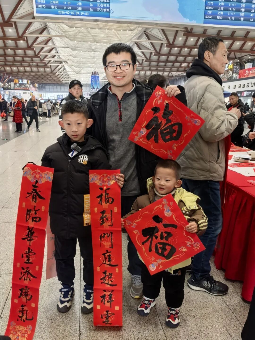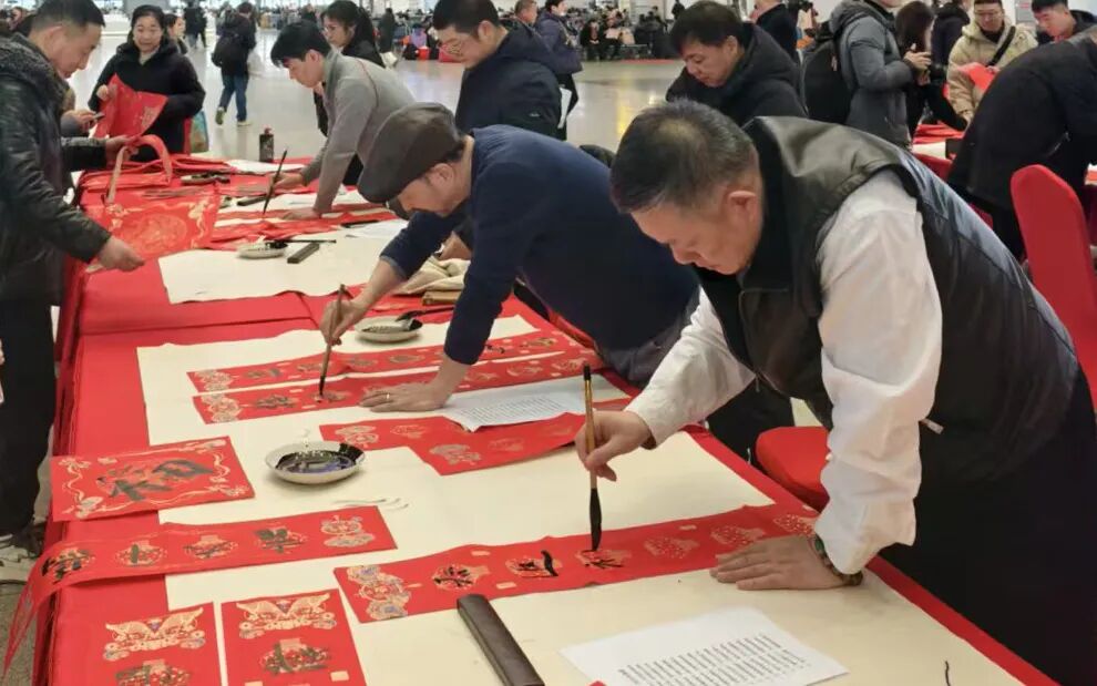 往来旅客纷纷驻足围观,有的在旁静静欣赏文艺家们的创作风采,有的主动上前邀请文艺家书写专属祝福,现场一派热闹祥和的新春景象。“老师写的特别好,我要把这份祝福带回家。”一位返乡旅客捧着刚写好的春联,脸上洋溢着幸福的笑容。