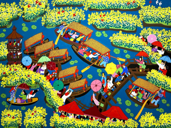 这幅作品聚焦兴化垛田油菜花盛景,以浓艳蓝黄为主色调,铺展水乡肌理。明黄花海中,乌篷船载游客穿梭,花伞摇曳、人群欢腾,将新春踏春的热闹与地域特色深度相融。作品以农民画质朴笔触,定格家乡“田无一垛不黄花”的春日盛景与乡村文旅兴旺图景,每一笔勾勒皆饱含对故土深情,尽显兴化水乡的鲜活生机与新春红火气象。