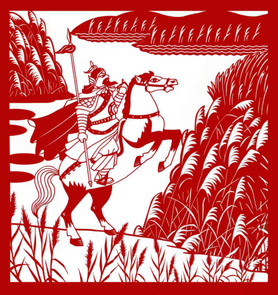 本作品为兴化垛田春节贺岁剪纸,以岳飞抗金驻师旗杆荡的历史为核心,融入水乡芦苇、垛岸风貌。采用镂空、阴刻与阳刻结合的传统技法,勾勒岳飞立马征战的英武身姿。马年新春之际,既借骏马寄“一马当先”“马到成功”之愿,又以非遗技艺传承地方历史与爱国文化,尽显地域、历史与节日特色。