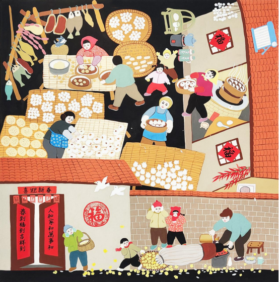 采用重彩年画技法创作,构图饱满,色块平涂加勾线塑造人物,花编与福字融入剪纸手法,色彩明艳喜庆。画作聚焦新年前的农家小院,院内咸货高悬,一家人分工赶制米团、包子、年糕等年味美食;院墙外孩童捂着耳朵,翘首期盼爆米花出炉。备年货的热闹场景,孩童穿梭嬉戏的鲜活画面,尽显家乡冬日里闲适又浓郁的新春烟火气。
