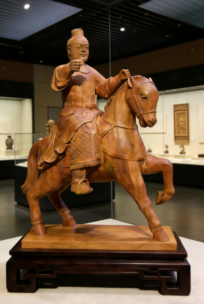 梨花木精雕鞍马人物,姿态昂扬,衣袂与鬃毛线条流畅,尽显“承风而行”的豪迈动感。刀法细腻入微,铠甲纹理清晰规整,马身肌肉层次分明,木质温润光泽与雕塑力量感浑然相融。作品以鞍马意象寄寓“金戈铁马”的气魄与“人强马壮”的愿景,借传统木雕工艺之精湛,传递出国泰民安、山河锦绣的美好祝愿。