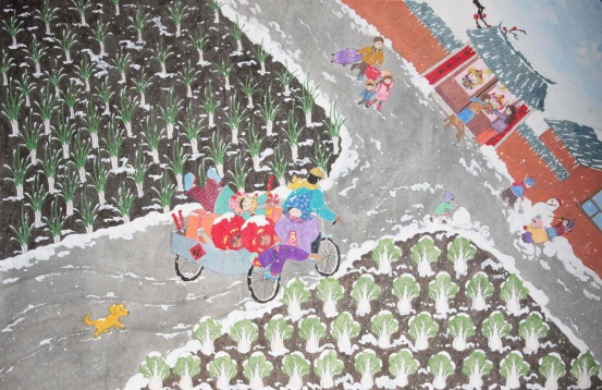 大寒岁末,雪覆兴化垛田。这幅农民画以明艳笔触,定格水乡备年货的热闹图景:冰雪菜畦里青菜青葱傲立,满载年货的三轮车穿村而过,孩童嬉雪、家家掸尘布新,腊味飘香间年味渐浓。画面融入“大寒百无禁忌、诸事皆吉”的乡俗,在极寒中渗入团圆暖意,让垛田的年俗乡愁与来年希冀,随飞雪鲜活流淌。