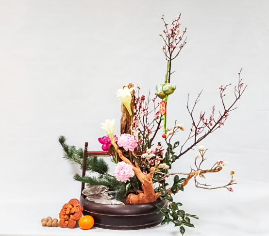 岁朝清供,乃文人寄寓新春期许之雅事。此作巧以圆食盒为器,暗喻阖家团圆之美意。撷梅、兰、松枝映岁寒,百合、玉兰、茶梅绽新春,缀锦绣葫芦以纳福禄,配橘子兆吉、灵芝如意、桂圆合欢、石榴木映红。一室清芬融雅韵,恰合岁朝吉庆,祈马年玉堂富贵,福禄满园,喜乐安康,瑞气盈门。