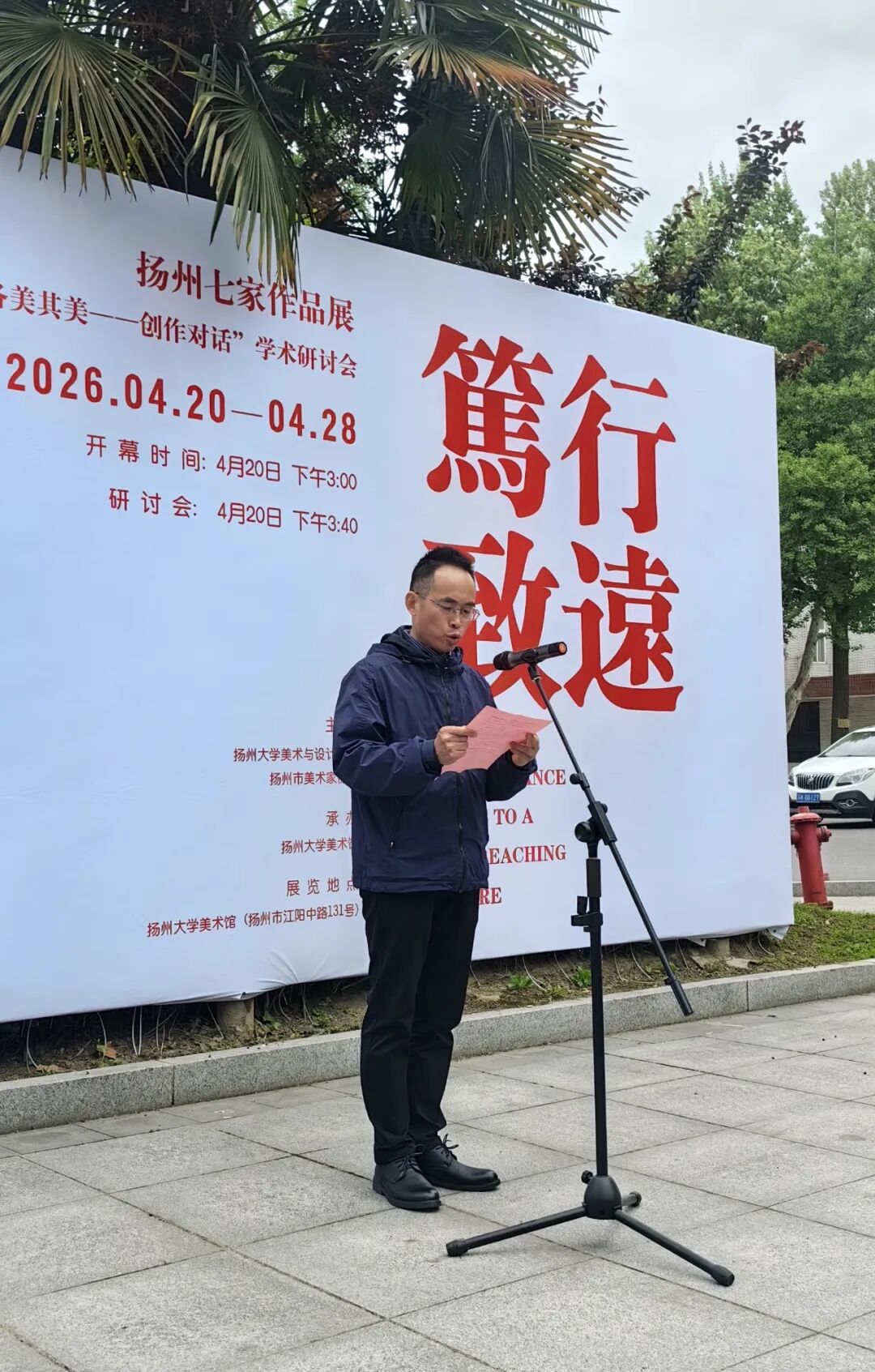 4月20日下午,由扬州大学美术与设计学院、扬州市美术家协会主办,扬州大学美术馆承办的“笃行致远——扬州七家作品展”开幕式在扬州大学路南校区隆重举行。开幕式由扬州大学美术与设计学院党委书记林超主持,扬州大学副校长韩杰,扬州市文联党组成员、副主席、三级调研员吴乃怀,美术与设计学院院长谢玮分别讲话。扬州市美协主席李玫、常务副主席刘玉海、副主席陈侬、秘书长梁鹤新出席开幕式,扬州大学、扬州市档案局、扬州市国画院、扬州晚报等单位领导、各界朋友、参展艺术家、师生代表近两百人参加了本次活动。