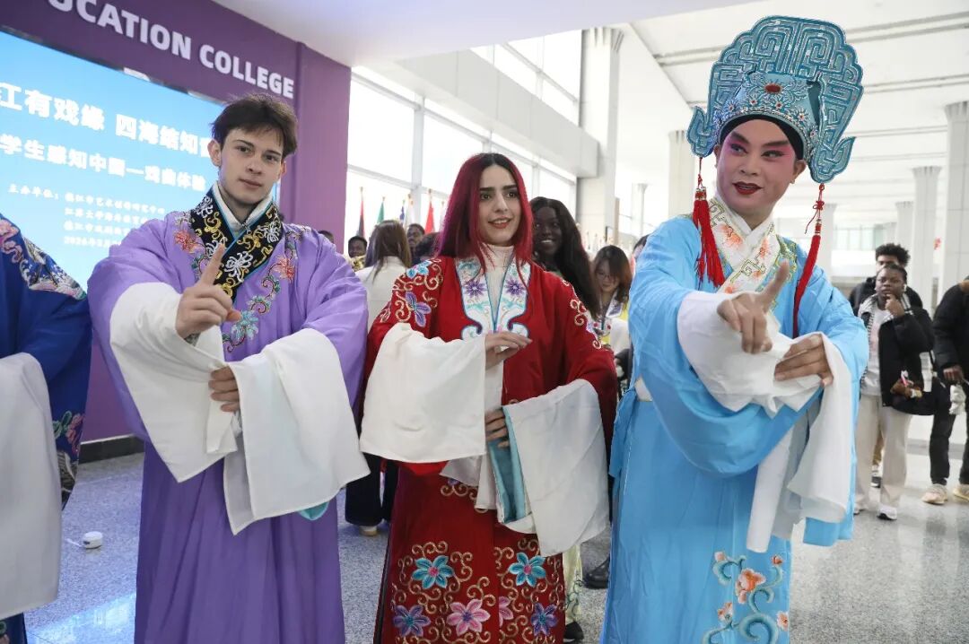 “衣脉相承·戏服打卡”作为活动的核心互动环节,多位留学生们踊跃参与,穿上不同行当人物的戏服,纷纷跟着演员模仿学习小生、花旦基础身段,在一招一式中快速解锁戏曲程式化动作,收获满满。