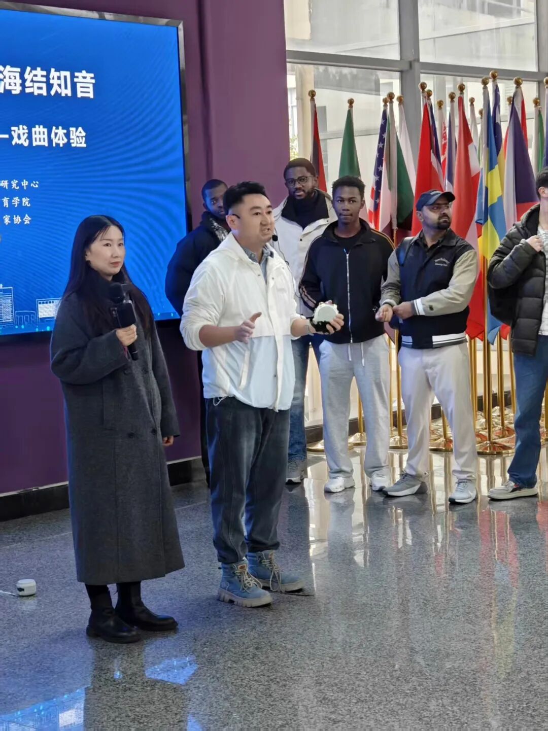 市剧协副秘书长冯磊与海院辅导员穆亚格携手搭档,担任主持与双语翻译。市剧协骨干、镇江市文化指导师王皓、曹雨化身经典角色“梁山伯”与“祝英台”,深入到留学生中,以扬剧《十八相送》开启这场跨文化的戏曲之约。
