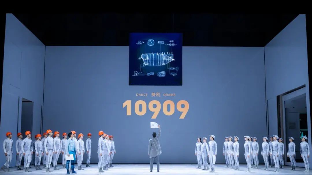 舞剧《10909》以我国自主研发“奋斗者”号全海深载人潜水器,创造10909米的载人深潜新纪录的过程为主线,展现了“奋斗者”号研制并成功海试的过程。该剧以中国船舶七〇二所三代科研工作者为原型,通过舞蹈语汇将“简单质朴的师生情”“友情”“真实的人”“科技”相融合,将科技探索与深海之美融为一体,展现出当代科研工作者“最美奋斗者”形象,用舞蹈述说“新质生产力”背后的故事。