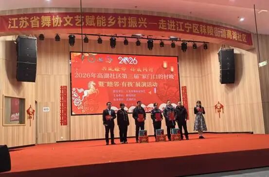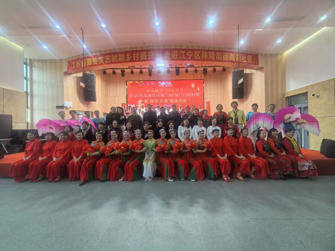 为推动基层文化建设,打造乡村文艺阵地,开展文艺强基工程,2月7日下午,江苏省舞蹈家协会携手南京市江宁区秣陵街道高湖社区共同打造第三届“家门口”的村晚,与村民们一起喜迎马年春节。省舞协顾问张俊、副秘书长温松华及省文联组联部、高湖社区干部群众400余人一同参加了活动。