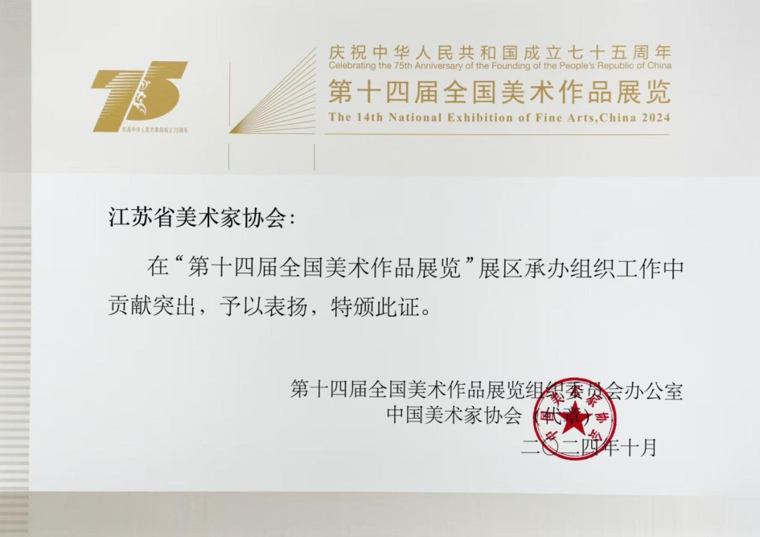 另一方面,省美协积极动员组织全省美术家进行创作备战,先后召开动员会、辅导讲座等20余场,为美术家们提供了专业的指导和交流的平台,显著提升了江苏美术家的创作水平与冲刺实力。最终,江苏在第十四届全国美展中斩获佳绩,入展作品296件,进京作品36件,入选数量较上届实现稳步增长。其中,中国画、版画两大画种的入选数量均位列全国第二,中国画与油画选送入展率高达90%,位居全国首位。省美协获评中国美协颁发的展区承办组织工作奖、作品创作组织工作奖。