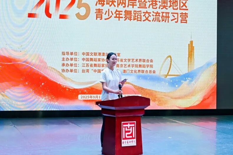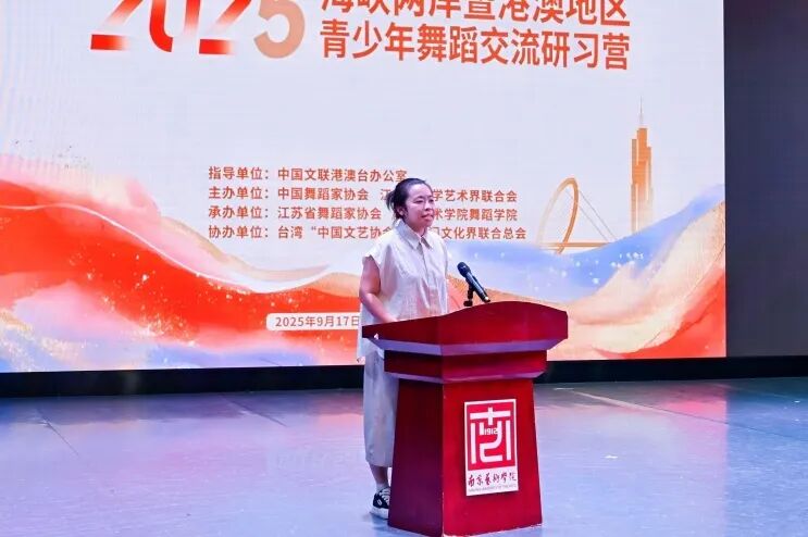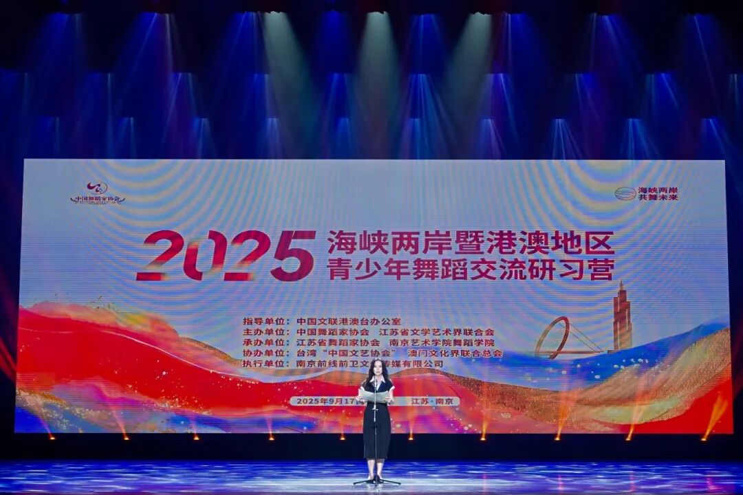 舞蹈是共同传承和弘扬中华文化的重要途径。9月18日晚,2025海峡两岸暨港澳地区青少年舞蹈交流研习营开幕式暨“海峡两岸共舞未来”主题演出活动在南京艺术学院南艺剧场举行,中国舞蹈家协会秘书长夏小虎,江苏省文联党组书记、副主席常胜梅,南京艺术学院党委书记俞锋,江苏省委台办二级巡视员余海,江苏省港澳办二级巡视员丁先忠,共青团江苏省委二级巡视员施静芝,江苏省文联二级巡视员韩军,台湾“中国文艺协会”理事暨舞蹈主任委员薛英娜,澳门文化界联合总会副会长郭英姿以及中国舞协、江苏省文联、南京艺术学院等相关领导及部门负责同志出席了开幕式。夏小虎、韩军、薛英娜、郭英姿分别致辞。