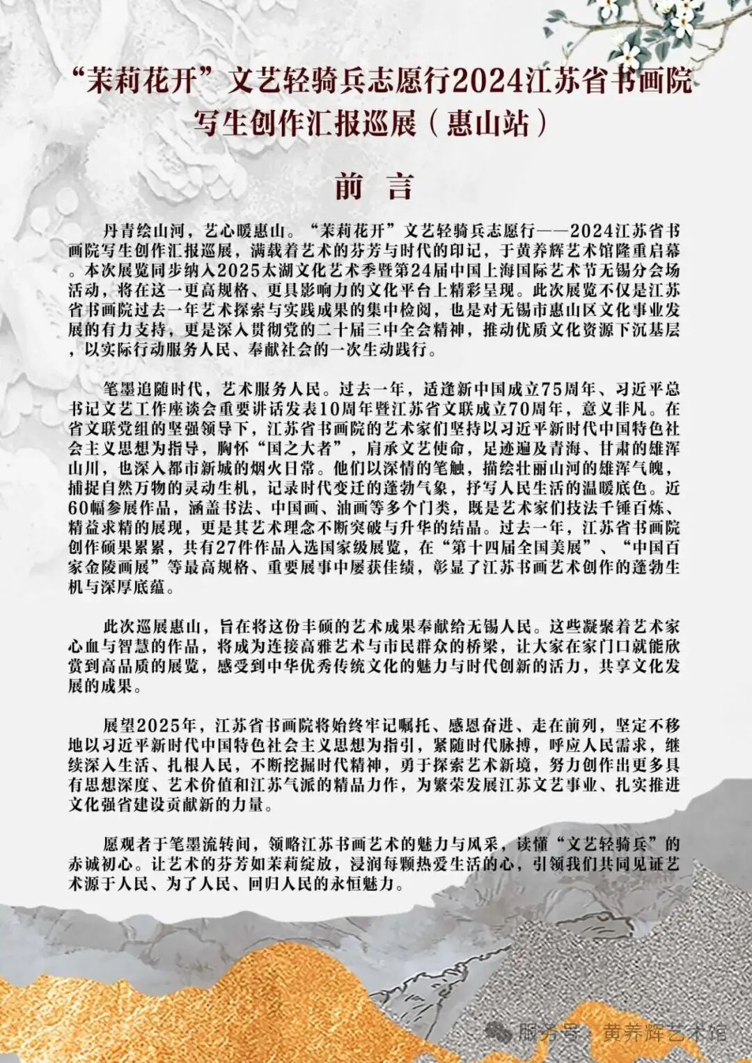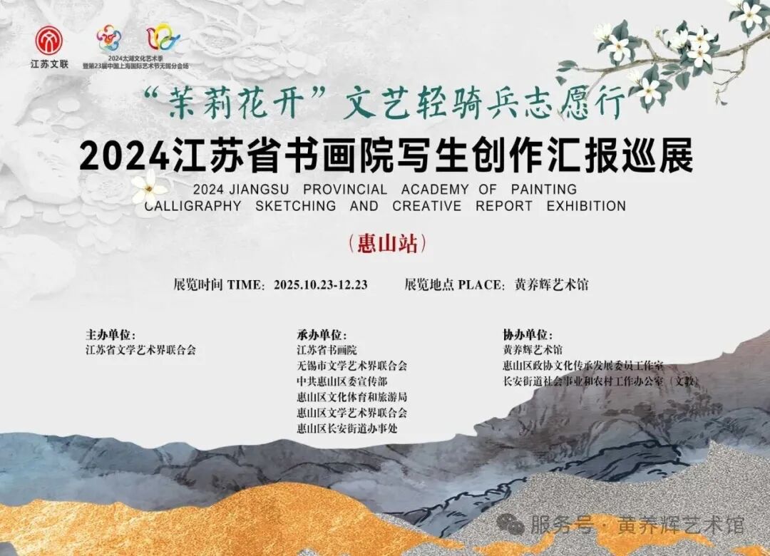 为深入贯彻党的二十届三中全会精神,推动优质文化资源下沉基层,以实际行动服务人民、奉献社会,2025年10月23日上午,“茉莉花开”文艺轻骑兵志愿行——2024江苏省书画院写生创作汇报巡展在无锡市惠山区黄养辉艺术馆正式启幕。作为2025太湖文化艺术季暨第24届中国上海国际艺术节无锡分会场的重要活动,此次展览以72幅书画精品搭建起艺术惠民桥梁,吸引了各界嘉宾与市民百余人来到展览现场,为惠山深秋注入浓郁艺韵。