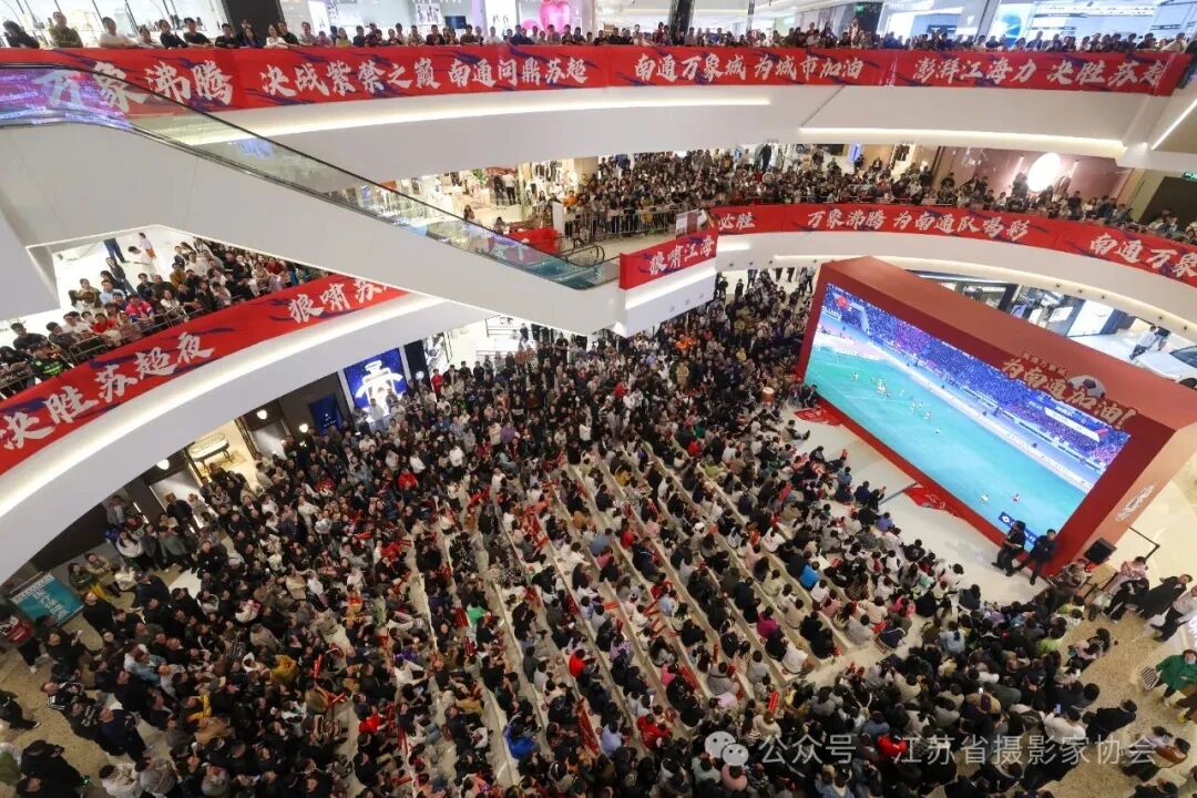 南通市民、球迷在万象城商场观看苏超比赛直播。陈俨 摄