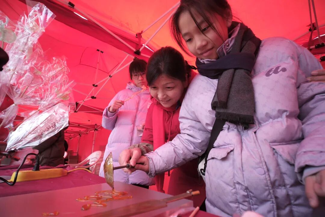 在孩子们的热情期待下,青少年民俗公教活动热闹开场。孩子们围在非遗传承人身边,跟着老师学习捏制“太平泥叫叫”,将一团团陶泥塑成憨态可掬的小动物;画糖人时,熬得金黄的糖稀在勺尖流转,转瞬化作栩栩如生的糖画,引得孩子们拍手叫好;现场编织的中国结、制作的木版年画,无不凝聚着孩子们对新年的美好期许。这场沉浸式的民俗课堂,不仅让青少年触摸到非遗技艺的温度,更让千年文化基因在欢声笑语中完成了一次生动的代际传递。