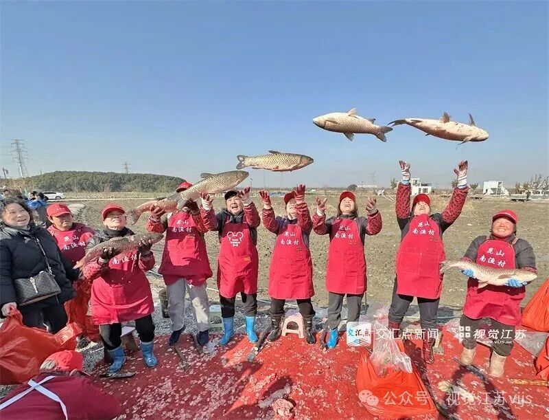 2026年2月3日,昆山市南渔村举办“干塘捕鱼闹年俗”活动,村民与参与活动的群众一起捞鲜鱼。图为村民将大鱼在空中抛出了一道“幸福的弧线”。时旭 摄