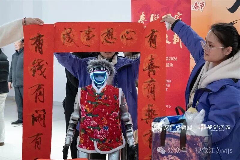 2026年2月4日,太仓市文化科技卫生“三下乡”启动暨“春风行动”文明实践集中服务活动在璜泾镇永乐邻里生活中心拉开帷幕,身穿花棉袄的机器人与工作人员协作展示春联,将人工智能技术与传统民俗结合,以创新形式传递新春祝福。姚惠秋 摄