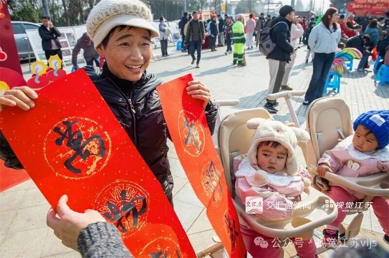 2026年2月4日,2026年宜兴市文化科技卫生“三下乡”集中服务活动,一位市民收到春联非常高兴,两位小宝贝却对春联非常好奇。朱智辉 摄