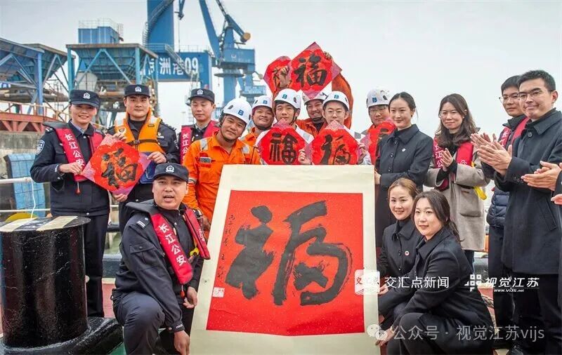 2026年2月5日,停靠在镇江新民洲码头的货轮“坦帕湾”上,墨香与笑语交织,年味随江风流动。长江航运公安局镇江分局扬州派出所联合润州区司法局、边检站等单位共同举办迎新春活动,船员和民警举“福”合影。滕超 摄