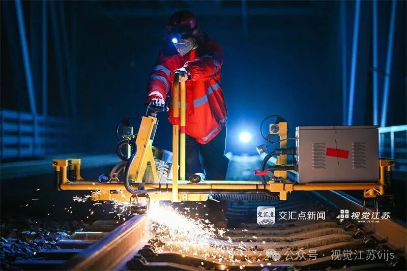 2026年2月11日凌晨,中国铁路上海局集团有限公司南京桥工段、南京电务段工电联合作业组根据春运需求,对京沪高铁南京大胜关长江大桥上的设备进行重点检查、养护、测试,确保春运期间铁路设备安全稳定。图为工作人员在京沪高铁南京大胜关长江大桥上进行钢轨廓形打磨作业。方东旭 摄