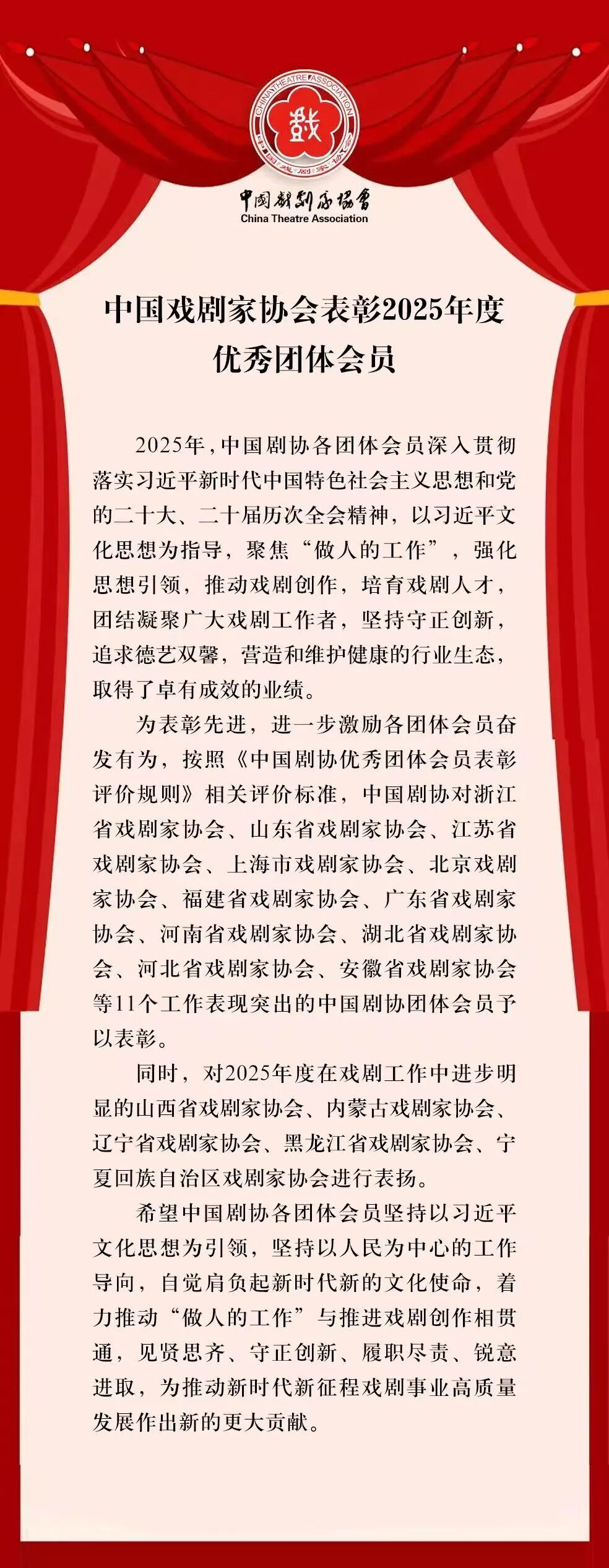 2025年,江苏省剧协在省文联党组的坚强领导下,以习近平新时代中国特色社会主义思想为指导,紧扣省委省政府工作部署,以“做人的工作”为核心,团结引领全省戏剧工作者,在传承中创新、在深耕中突破,推动江苏戏剧事业实现新跨越。4月16日,中国戏剧家协会公布2025年度优秀团体会员名单,江苏省剧协再次获评优秀团体会员。