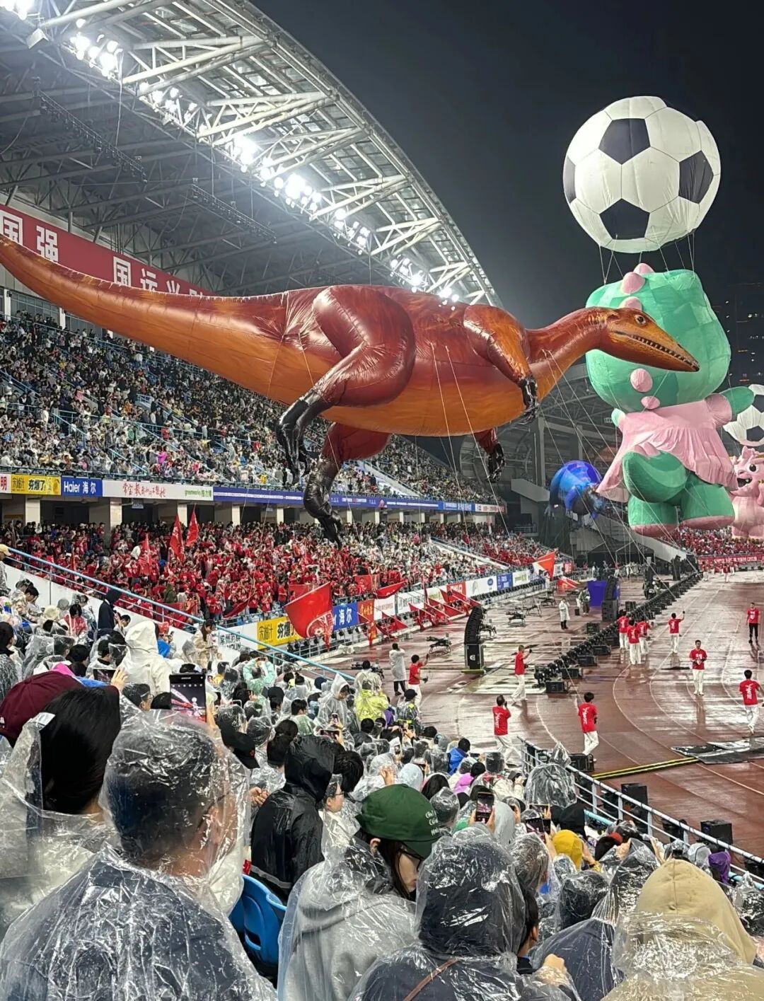 开幕式结束后,为不影响城市交通,恐龙园团队等到零点后才启程,花了两个半小时,从奥体缓缓护送它返回恐龙园。又因为工作人员不舍放掉充好的氮气,一路小心拖行,无心插柳,却成就了最有烟火气的名场面。