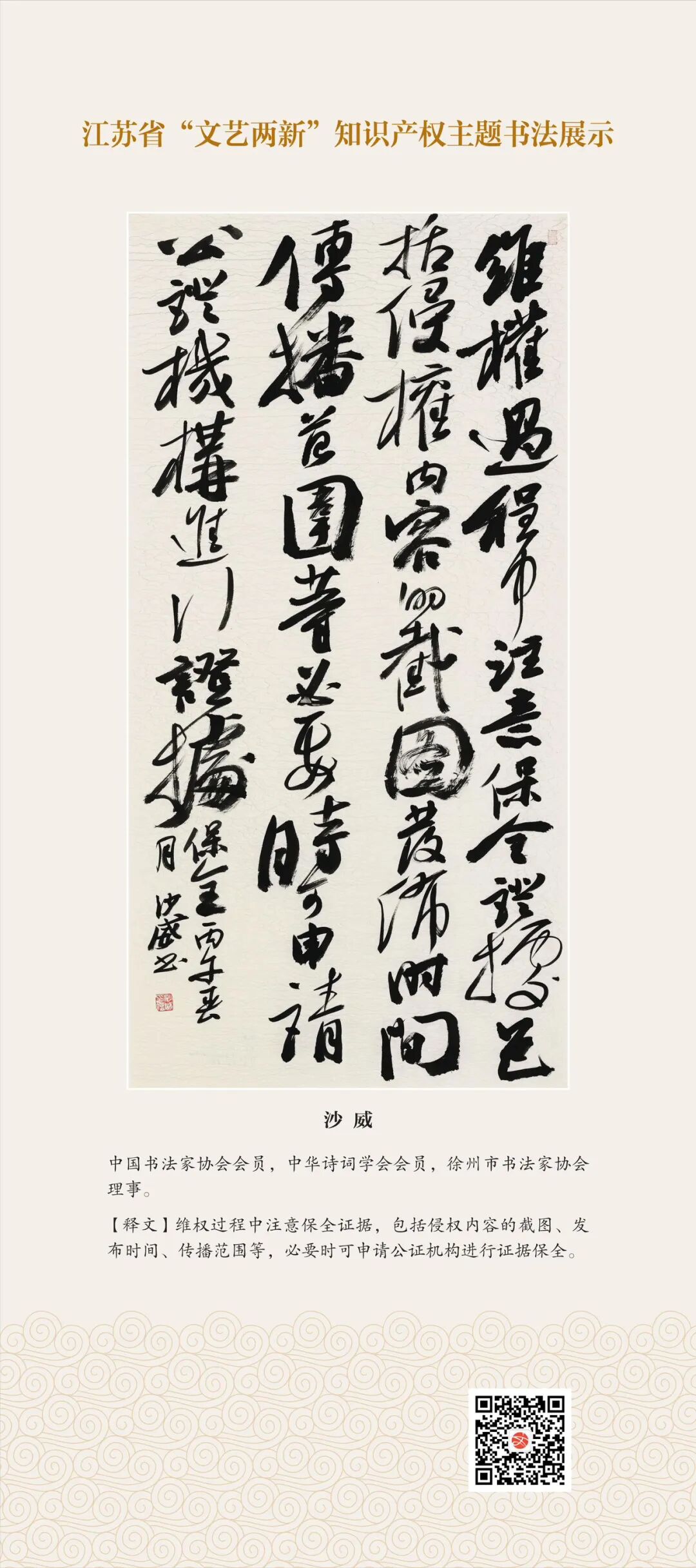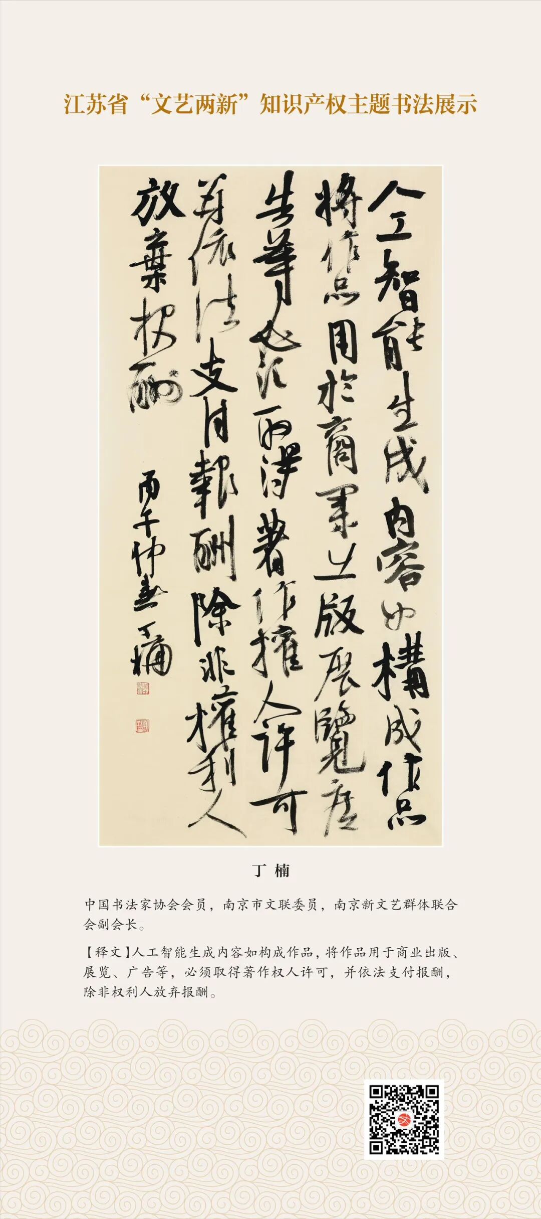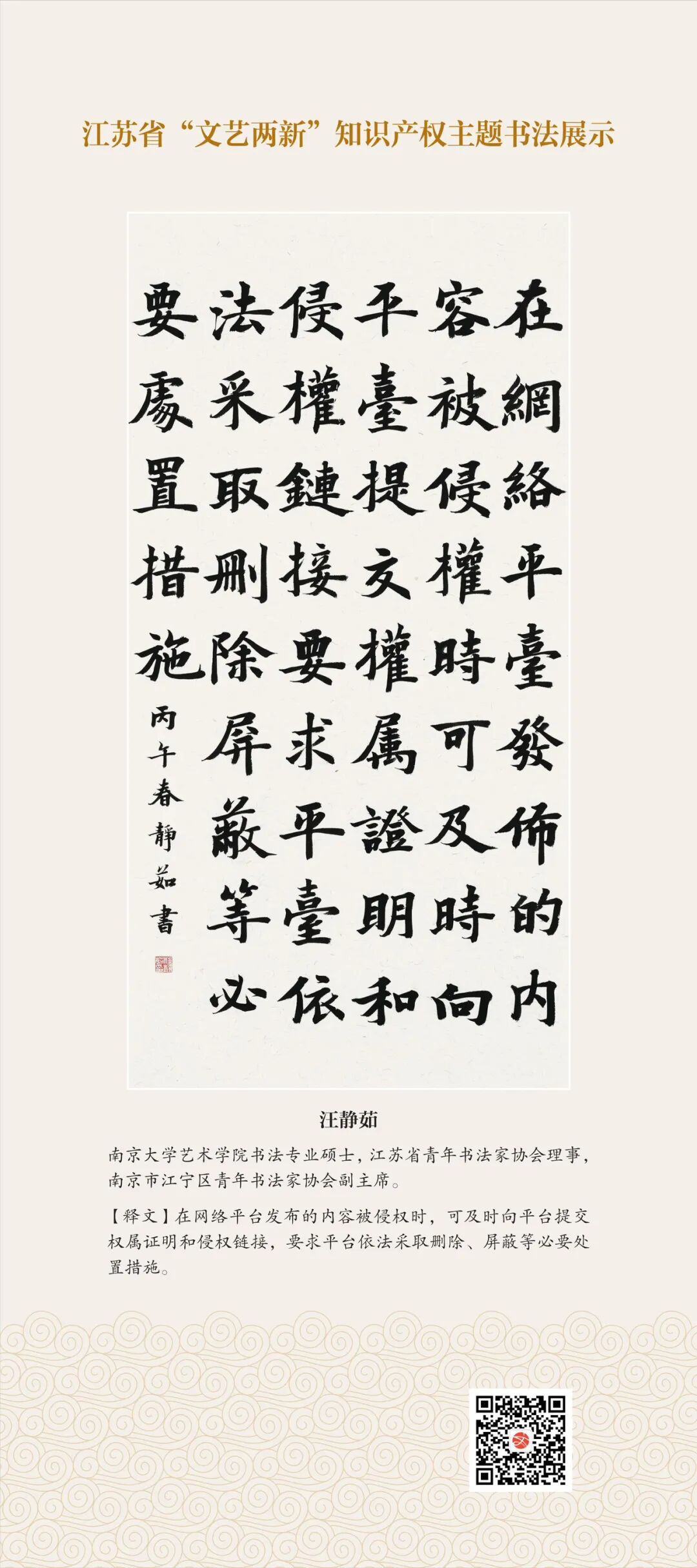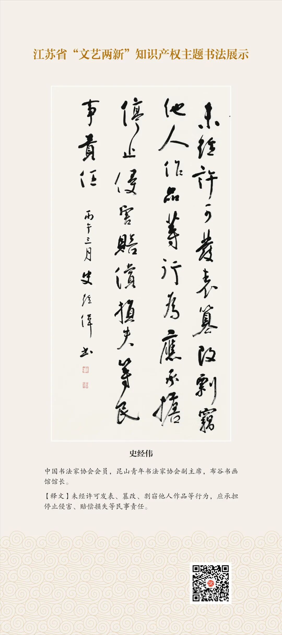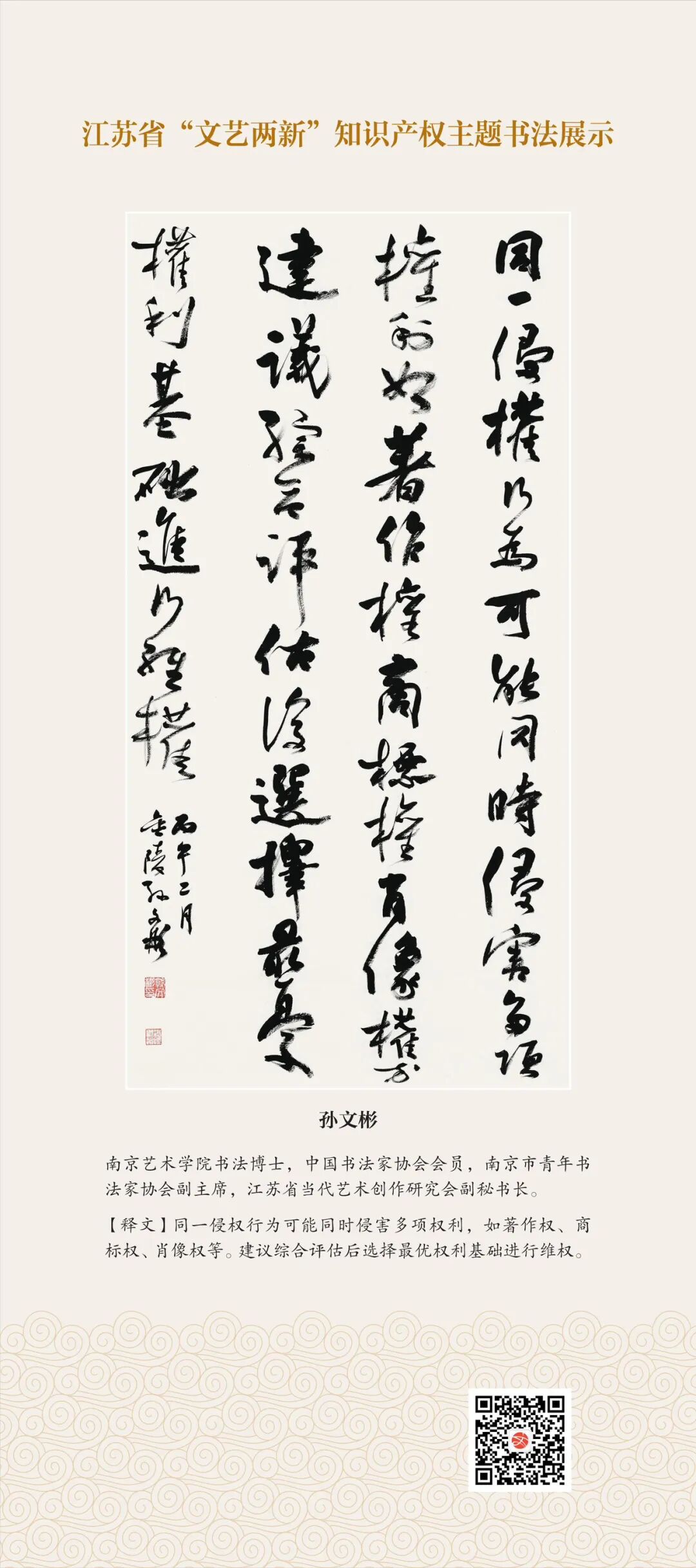 此次展示,是全省文联系统深入贯彻习近平文化思想、习近平法治思想的生动实践,是落实中国文联2026年知识产权宣传周部署、推进“文艺两新”工作高质量发展的创新举措。活动立足省级“文艺两新”实践基地,探索“法治+艺术”融合新路径,延伸服务触角、强化维权引领,让文艺初心与法治精神同频共振,在赏墨韵之美中,普及知识产权理念,提升权益保护意识,共筑尊重原创、守护创新的良好生态,为江苏文化强省建设注入源源不竭的法治正能量。