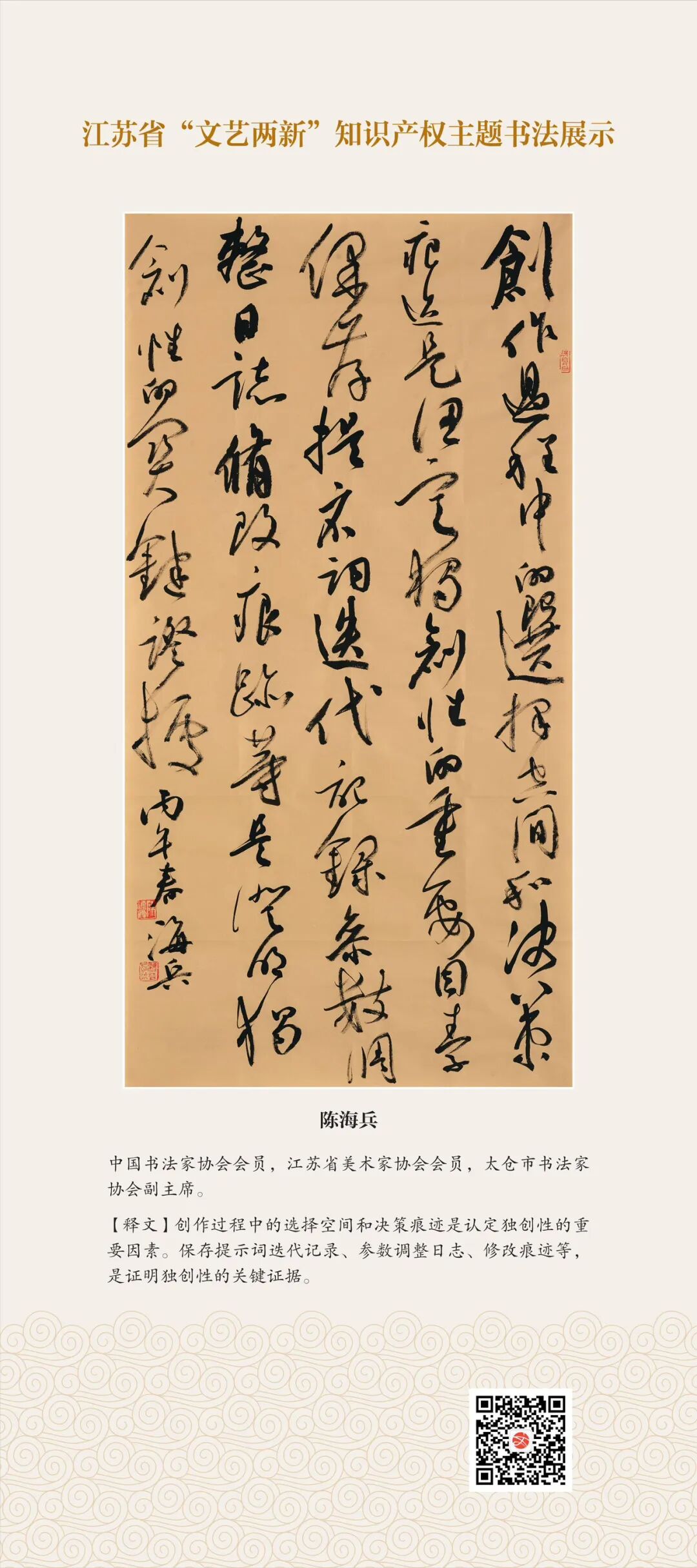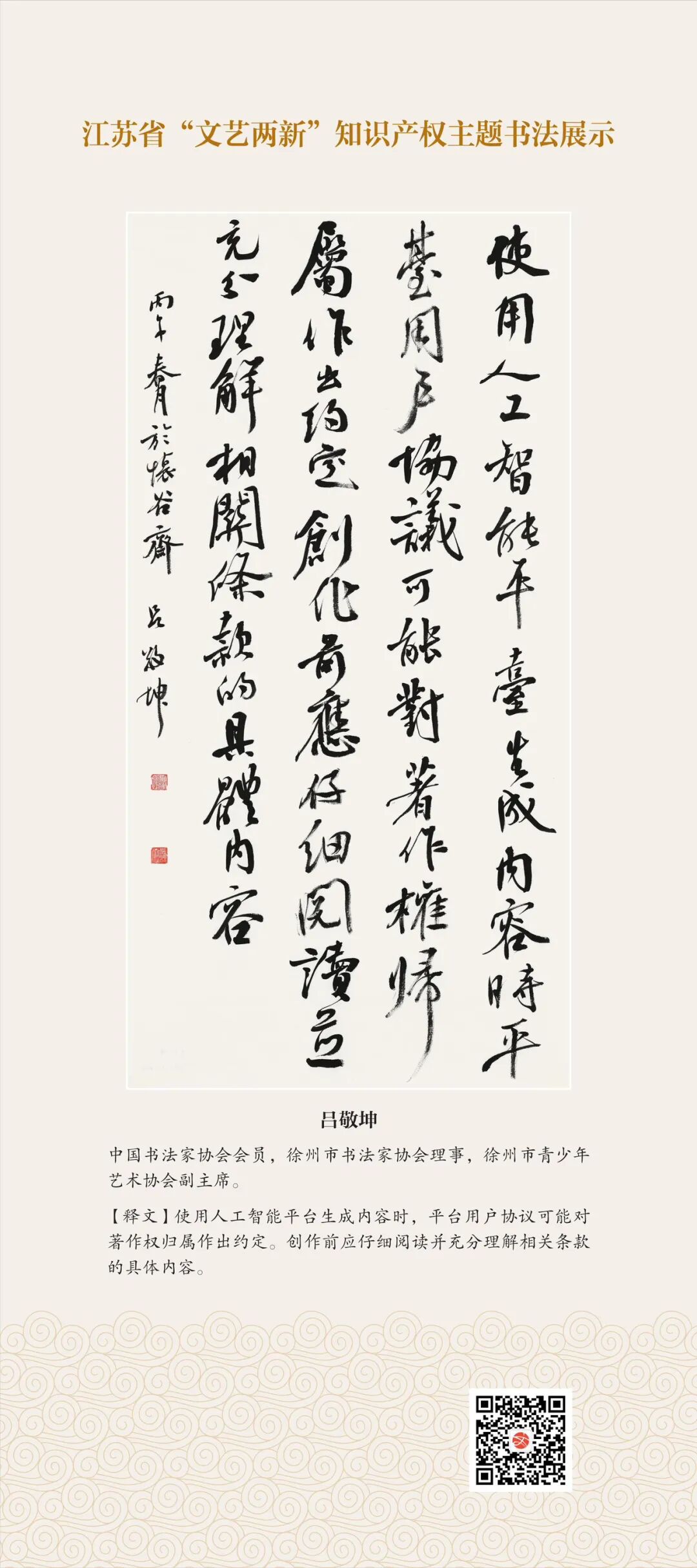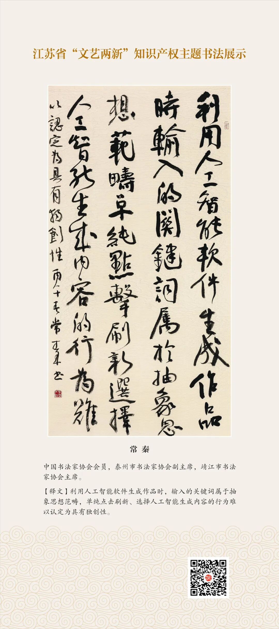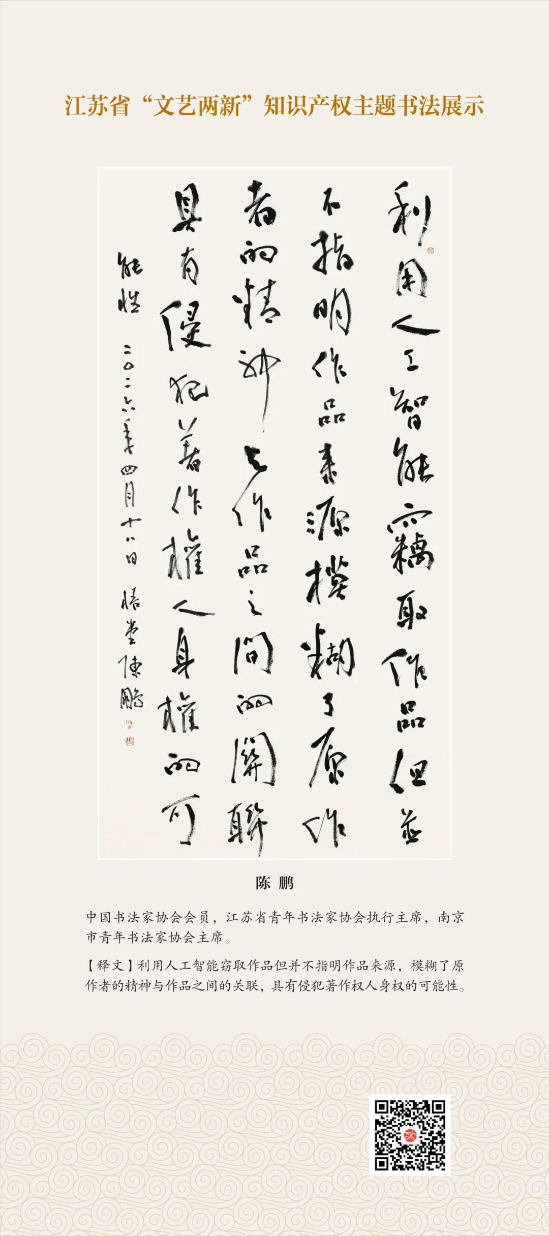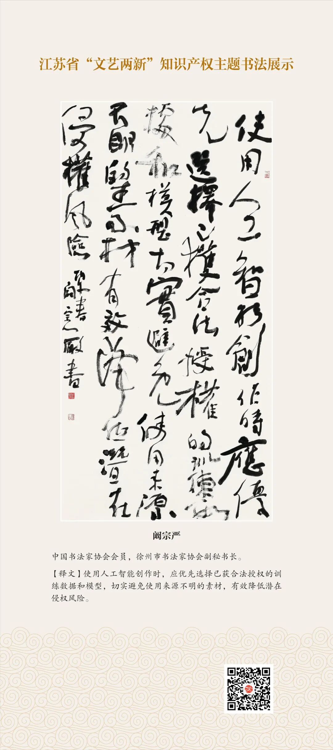 此次展示,是全省文联系统深入贯彻习近平文化思想、习近平法治思想的生动实践,是落实中国文联2026年知识产权宣传周部署、推进“文艺两新”工作高质量发展的创新举措。活动立足省级“文艺两新”实践基地,探索“法治+艺术”融合新路径,延伸服务触角、强化维权引领,让文艺初心与法治精神同频共振,在赏墨韵之美中,普及知识产权理念,提升权益保护意识,共筑尊重原创、守护创新的良好生态,为江苏文化强省建设注入源源不竭的法治正能量。