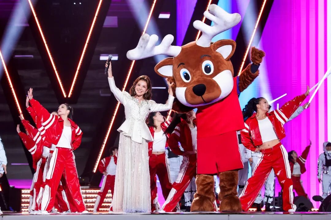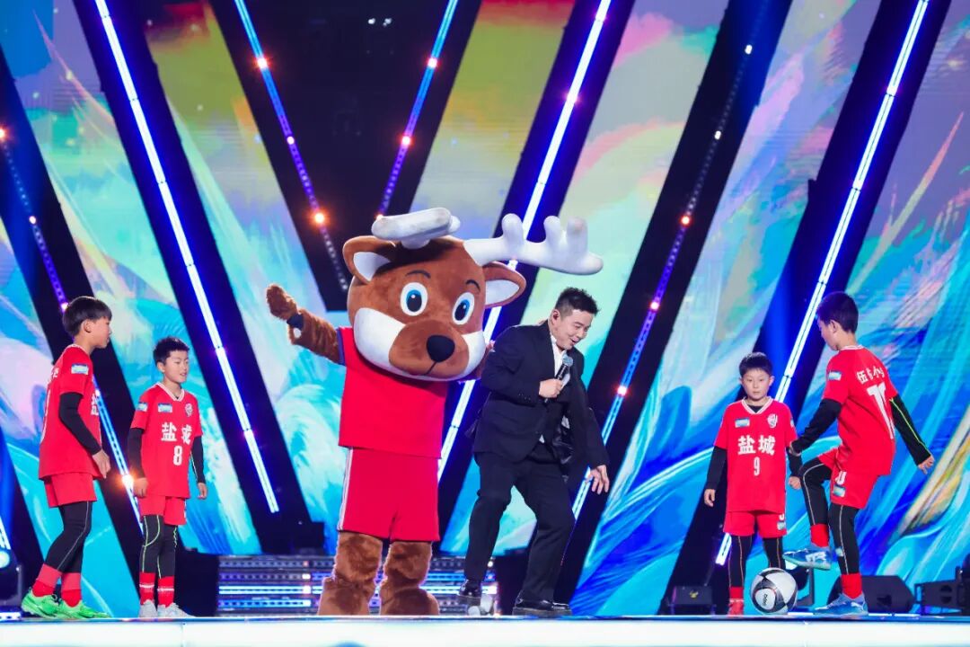 开场主题曲《有神采就有朋友》响起,“苏超”鹿战队吉祥物“麋鹿哥”跃上舞台,全场瞬间被点燃。水木年华与伍佑小学“足球小将”即兴过招,歌声里藏着少年的梦;球迷会会长带领数万人齐声高呼,声浪掀翻穹顶。台上是张韶涵与朱迅,台下是人山人海的“鹿战队”球迷,所有人都在为同一件事热血沸腾——为盐城队新赛季摇旗呐喊。