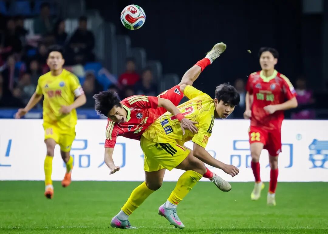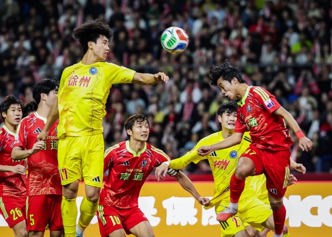 南通队球员(红色球衣)与徐州队球员(黄色球衣)在比赛中拼抢。徐培钦 摄