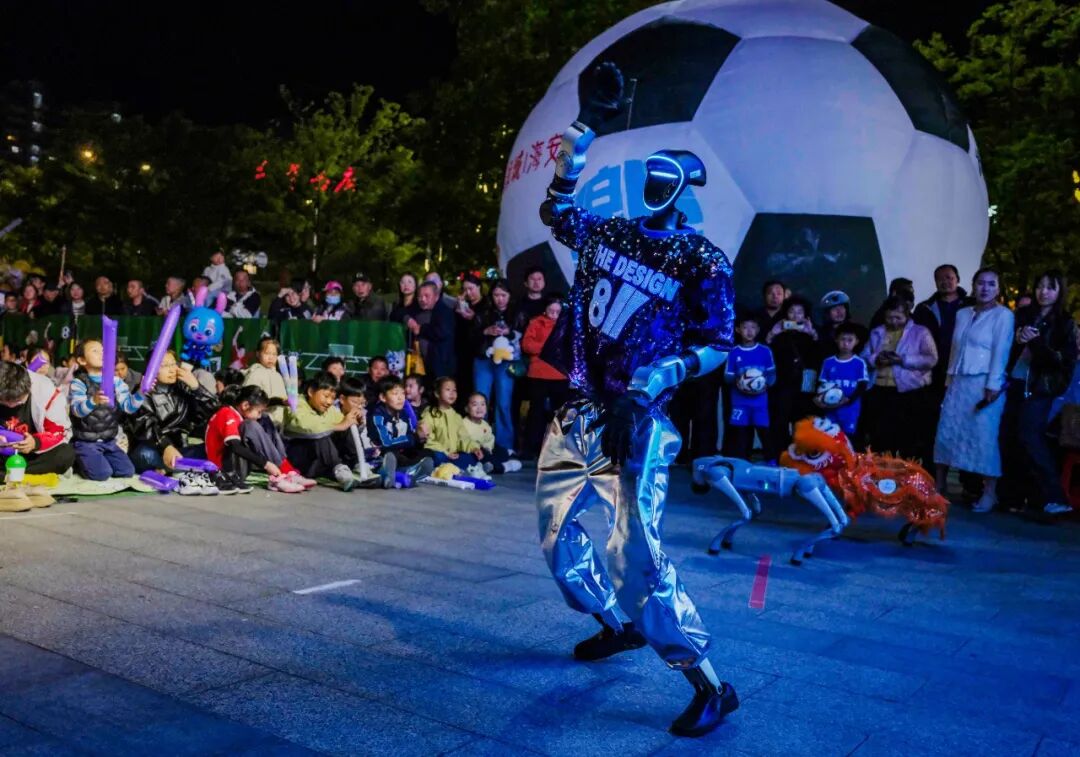 2026年4月25日,南通海安市喜润城“苏超”第二现场气氛热烈,机器人、机器狗表演以及小球员颠球表演,更引来阵阵喝彩声。徐劲柏 摄