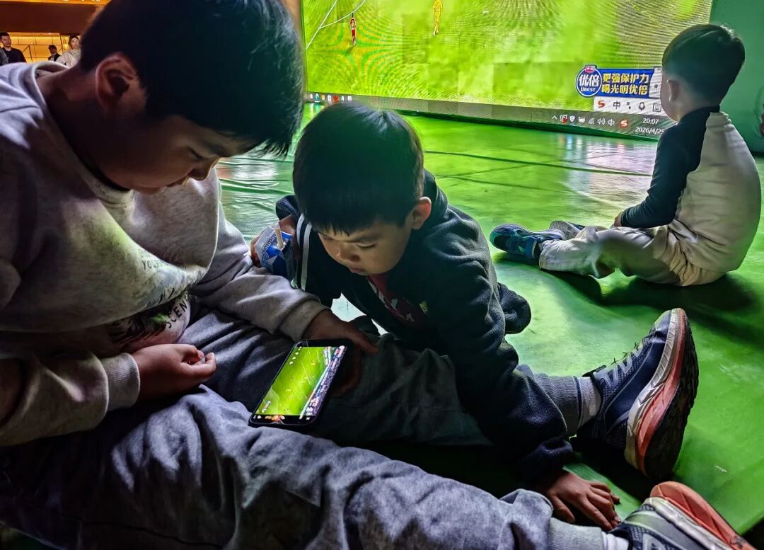 2026年4月25日,徐州万达广场门外,孩子用手机观看“苏超”比赛。郑舟 摄