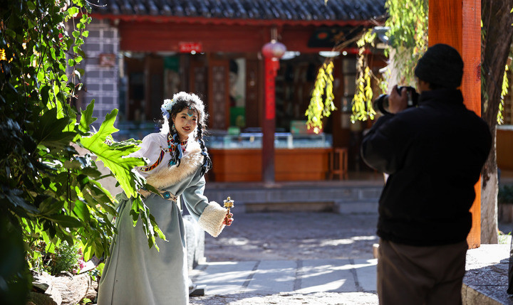 2026年1月13日,游客在丽江古城体验旅拍。新华社记者 江文耀 摄